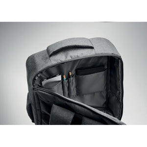 Schlanker 15'''' Laptop-Rucksack aus 300D RPET mit 210D RPET-Futter. Laptopfach, 2 Innentaschen, 2 Stiftfächer, gepolsterte Tragegriffen. Weich gepolsterte Rücken- und Schultergurte. Rückseitige Trolley-Halterung.