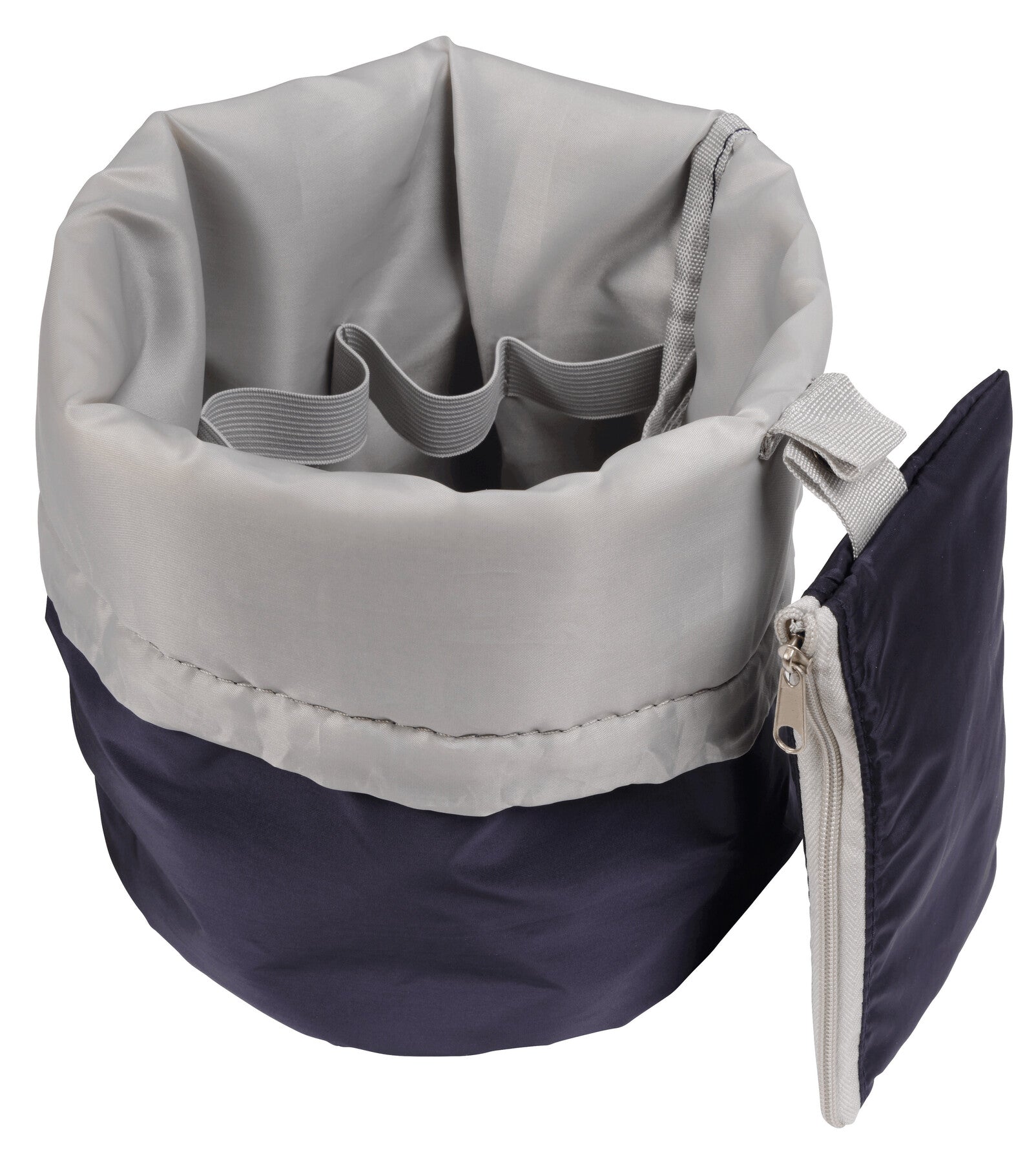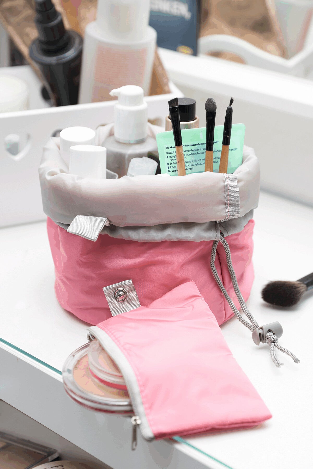 Kulturtasche TUBE: mit Kordelzug und Kunststoffstopper, innen mit 3 Netz-Einsteckfächern, 4 Flakonschlaufen und zusätzlichem Reißverschluss-Täschchen für kleine Kosmetikartikel, ist durch Druckknopf entnehmbar, gute Übersicht des Inhalts durch Umschlagen des oberen Randes