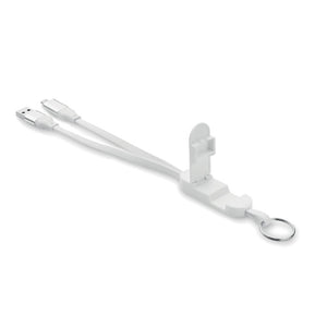 Schlüsselring mit Smartphone-Halter und 60W-Kabel. Gehäuse aus recyceltem ABS. Eingang: 2-in-1 Typ C und Typ A. Ausgang: Typ C und Mikro-B (2-in-1-Pin). Kabellänge: 26 cm.